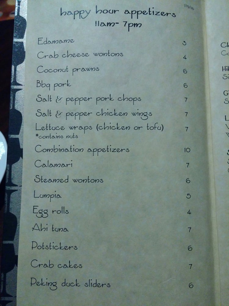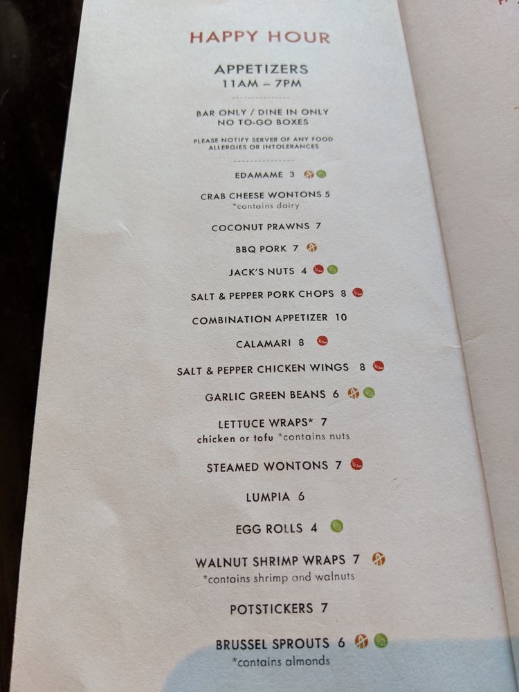 Coconut Prawns, Egg Rolls, BBQ Pork, Plain Chicken Wings, Crab Cheese Wontons